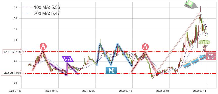 ♘ 支撑价格位4.44,可信任强度69.85%,距离最后交易2022-08-12形成的收盘价格5.15相差 -13.71%