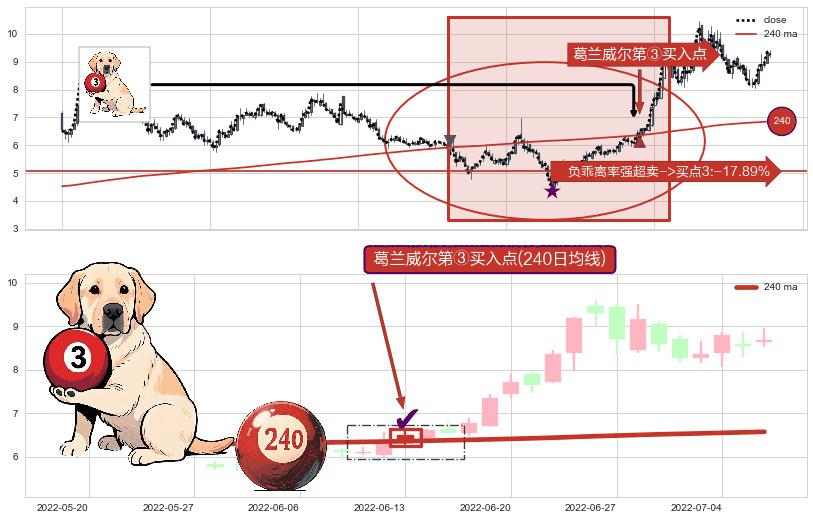 形态多维评估: ⚀ 2022-06-13-日显现 葛兰威尔均线 240日均线 第③买入点 上升趋势的中继信号,后市看涨,买进信号