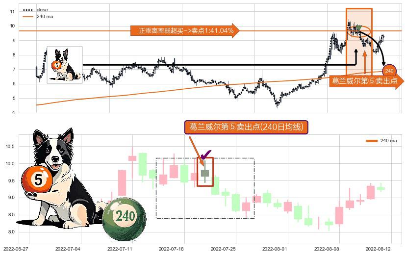 形态多维评估: ⚀ 2022-07-20-日显现 葛兰威尔均线 240日均线 第⑤卖出点 上升趋势均值回复的短线回落信号,后市看跌,卖出信号