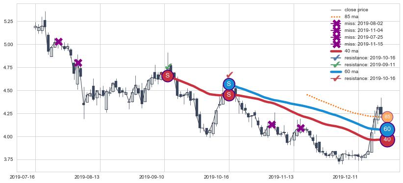 下跌趋势2019-07-16-2019-12-20,均线40, 60确认关键阻力2处