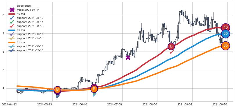 上涨趋势2021-04-12-2021-09-30,均线40, 60, 85确认关键支撑3处