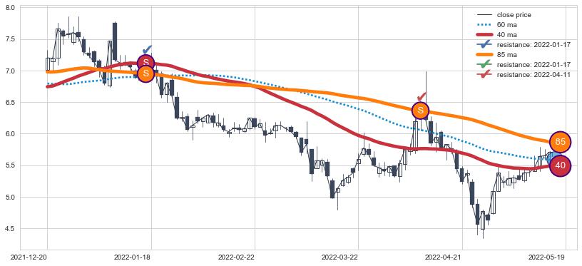 下跌趋势2021-12-20-2022-05-19,均线40, 85确认关键阻力2处