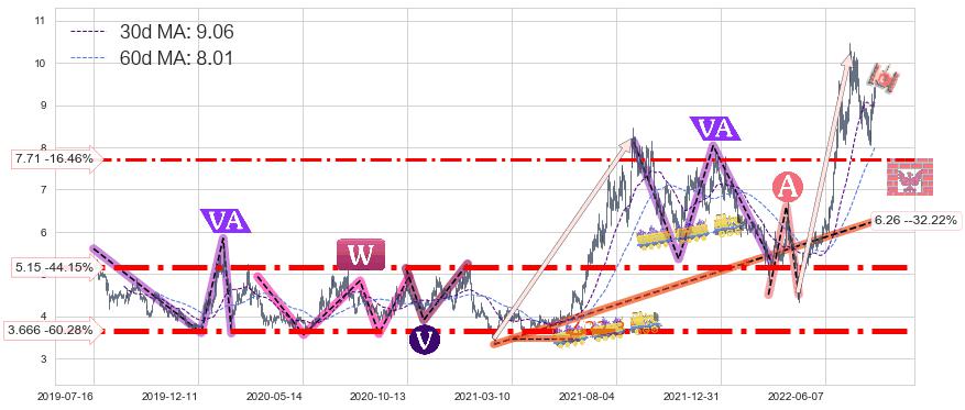 ♘ 支撑价格位7.71,可信任强度56.29%,距离最后交易2022-08-12形成的收盘价格9.23相差 -16.46%