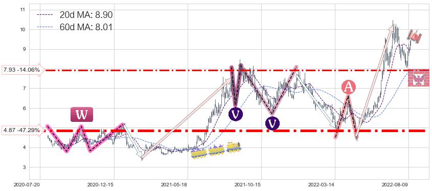 ♘ 支撑价格位7.93,可信任强度57.07%,距离最后交易2022-08-12形成的收盘价格9.23相差 -14.06%
