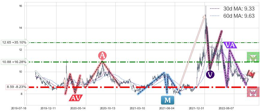 ♘ 阻力价格位10.88,可信任强度69.75%,距离最后交易2022-08-12形成的收盘价格9.36相差 +16.28%