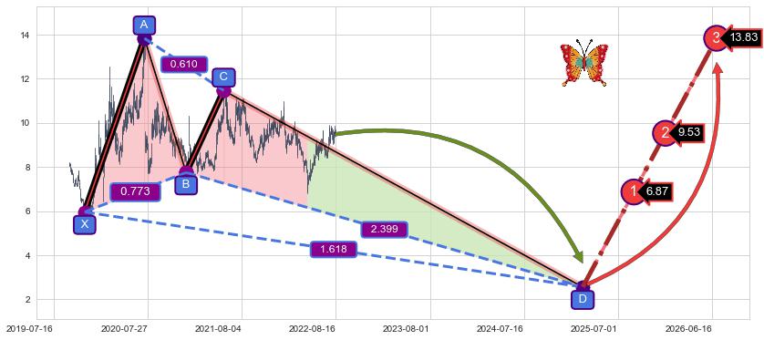 ➣ 未完成【蝴蝶】形态起点X: 2019-11-15, 已到达C点: 2021-05-27, 预测最终D点: 2025-02-19, 共1251交易日