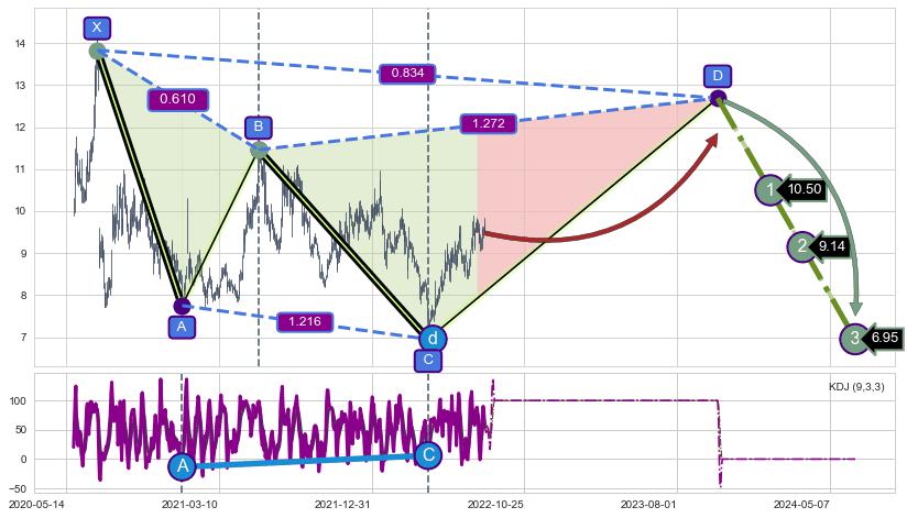 ➣ D点拟合预测价格12.69,距离最后交易收盘价格9.48相差 +33.83%
