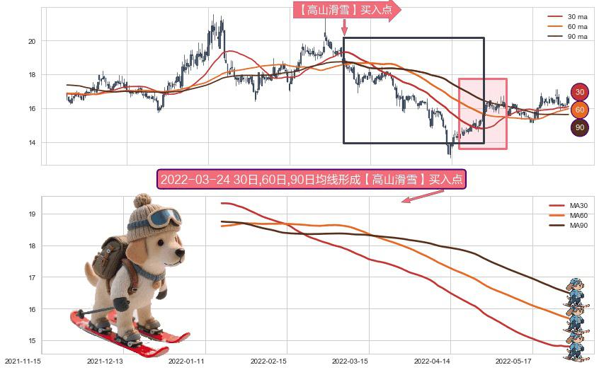 ⚀ 2022-01-17日-2022-05-30日显现 30日-60日-90日均线 【高山滑雪】买入点 看多信号,后市看涨,买入