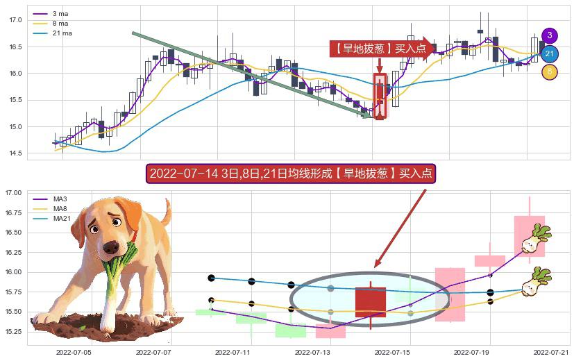 ⚀ 2022-07-14日显现 3日-8日-21日均线 【旱地拔葱】买入点 看多信号,后市看涨,买入
