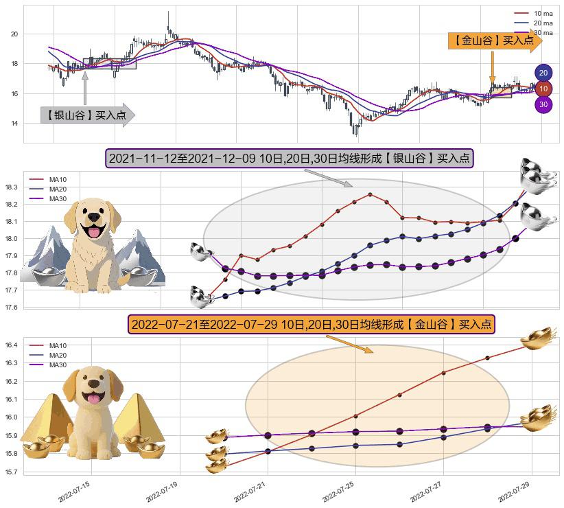 ⚃ 2022-07-22-日至2022-07-29-日显现 10日-20日-30日均线 【金山谷】买入点 其再次确认了买入信号,可靠性更强,买入