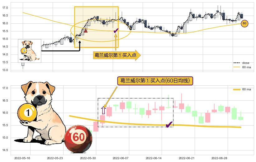 ⚀ 2022-05-31-日显现 葛兰威尔均线 60日均线 第买①入点 走势反转见底信号,后市看涨,买进信号