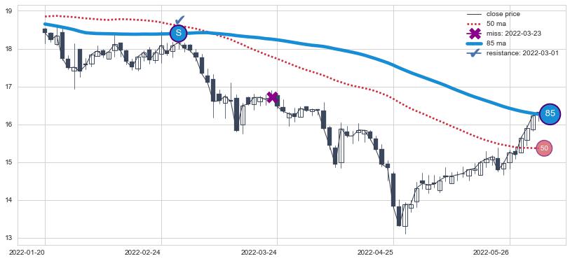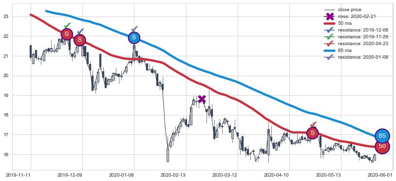 ⚄ 价格在均线遇到阻力后再次向下回落了【较短】距离, 第⑦卖出点 阻力效果【仍需验证】