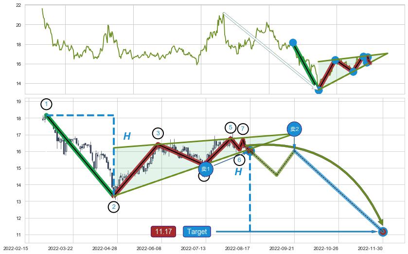 ➢ 最小中继整理跌幅→𝐇: 4.85 (𝐇楔型旗杆的长度:楔型起点→顶点)