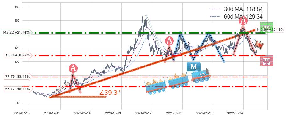 ♘ 阻力价格位142.22,可信任强度93.07%,距离最后交易2022-08-12形成的收盘价格116.82相差 +21.74%