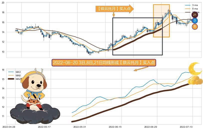 形态多维评估: ⚀ 2022-05-25日-2022-07-13日显现 3日-8日-21日均线 【烘云托月】买入点 看多信号,后市看涨,买入