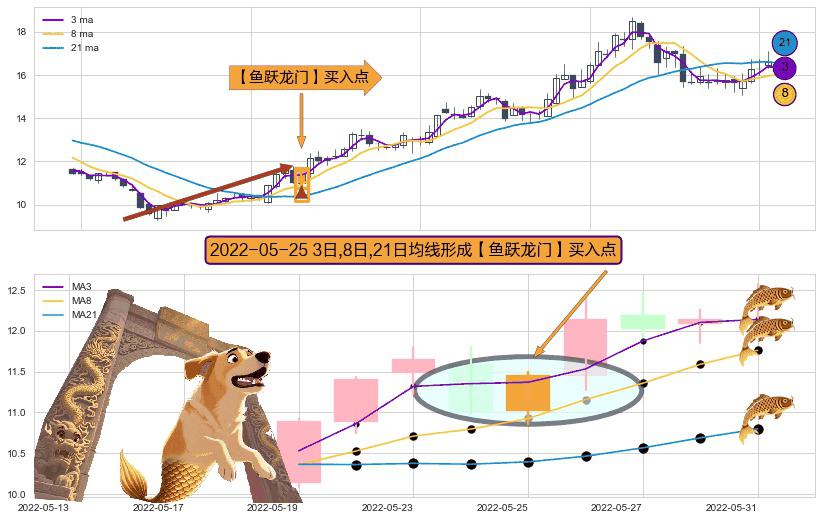 形态多维评估: ⚀ 2022-05-25日显现 3日-8日-21日均线 【鱼跃龙门】买入点 看多信号,后市看涨,买入