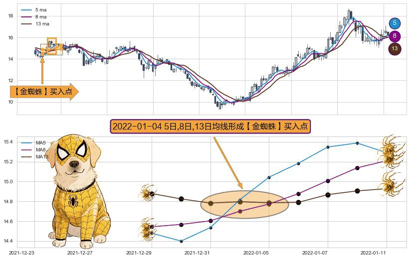 形态多维评估: ⚀ 2022-01-04日显现 5日-8日-13日均线 【金蜘蛛】买入点 看多信号,后市看涨,买入