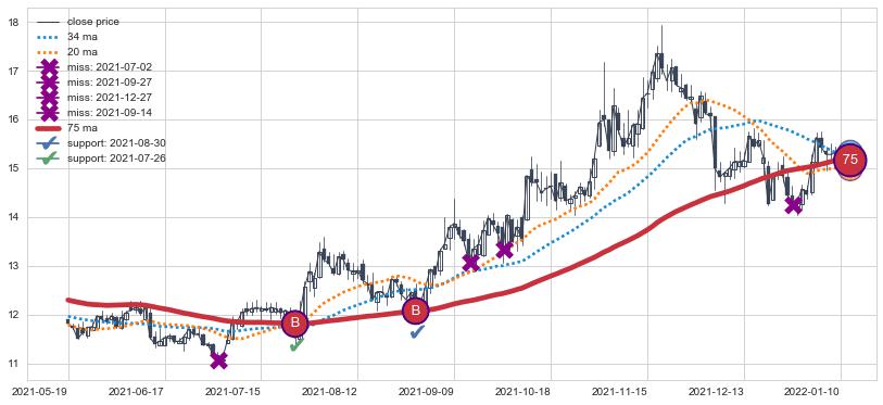 上涨趋势2021-05-19-2022-01-10,均线75确认关键支撑2处