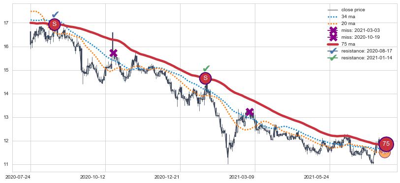 下跌趋势2020-07-24-2021-07-09,均线75确认关键阻力2处
