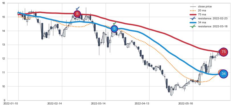 下跌趋势2022-01-10-2022-06-01,均线34, 75确认关键阻力2处