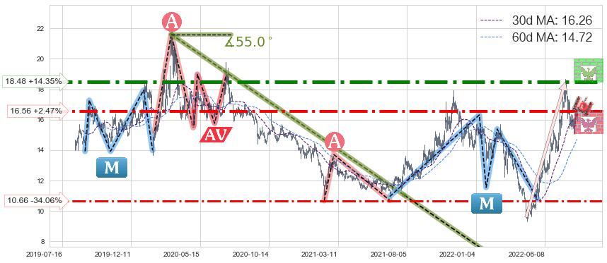 ♘ 阻力价格位18.48,可信任强度95.28%,距离最后交易2022-08-12形成的收盘价格16.16相差 +14.35%