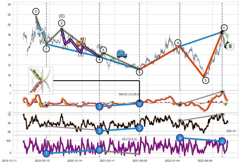 ➢ 1,3,5驱动浪MACD, RSI, KDJ走势都出现【常规背离】反转信号增强