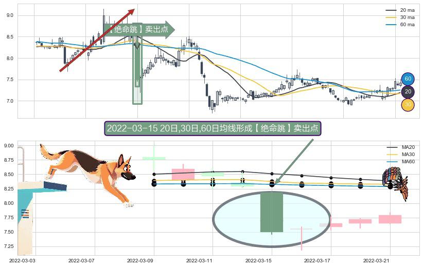形态多维评估: ⚀ 2022-03-15日显现 20日-30日-60日均线 【绝命跳】卖出点 看空信号,后市看跌,卖出