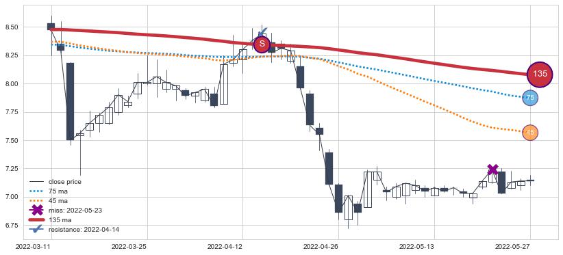 下跌趋势2022-03-11-2022-05-27,均线135确认关键阻力1处