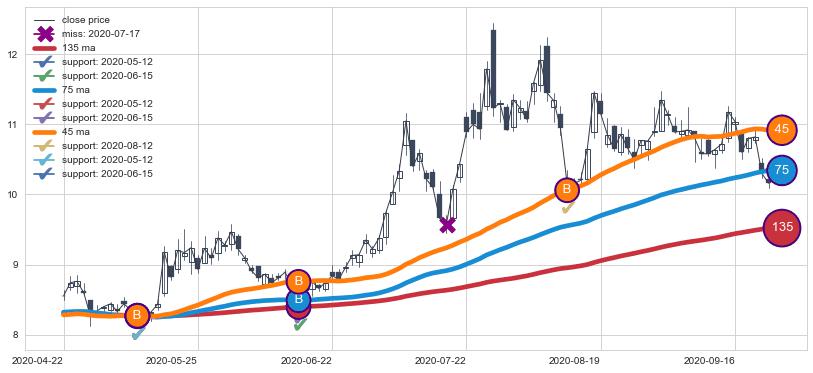 上涨趋势2020-04-22-2020-09-23,均线75, 45, 135确认关键支撑3处