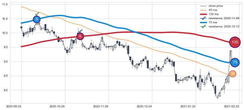 下跌趋势2020-09-23-2021-02-22,均线75, 135确认关键阻力2处