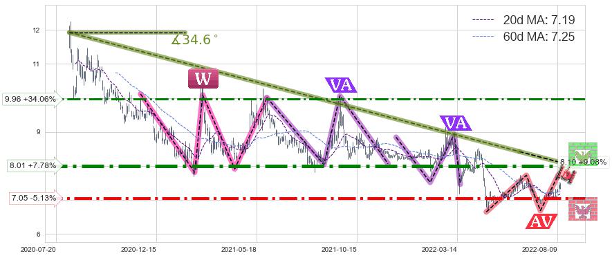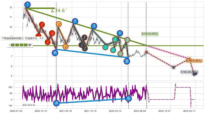 ♘ 阻力价格位8.01,可信任强度87.98%,距离最后交易2022-08-12形成的收盘价格7.43相差 +7.78%