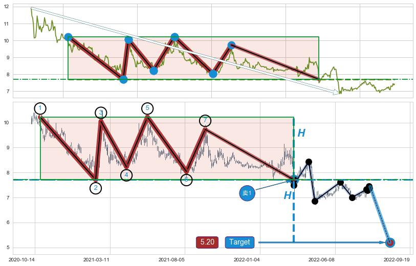 ➢ 【多方力量耗尽,空方打破攻守平衡点】下降三角形中继整理, 已在2022-03-15突破【支撑】颈线 7.87 →演变成下降通道