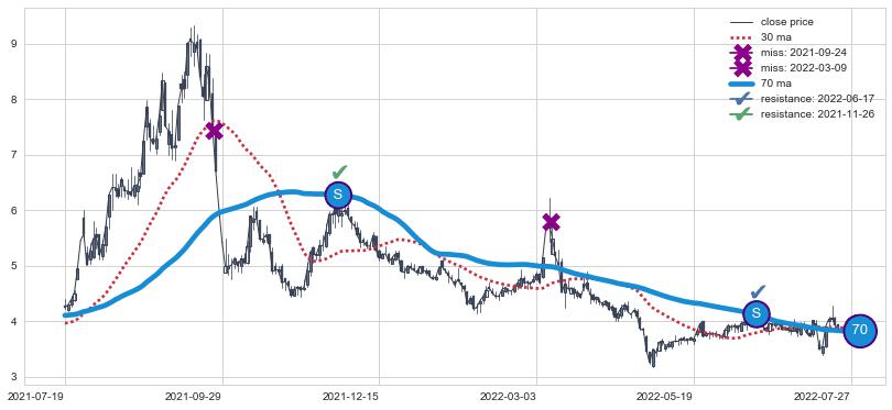 ⚄ 价格在均线遇到阻力后已再次向下回落了【较长】距离, 第⑦卖出点 阻力效果得到【初步确认】