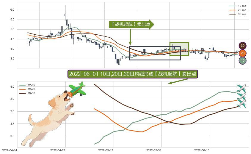 ⚀ 2022-05-11日-2022-06-23日显现 10日-20日-30日均线 【战机起航】卖出点 看空信号,后市看跌,卖出