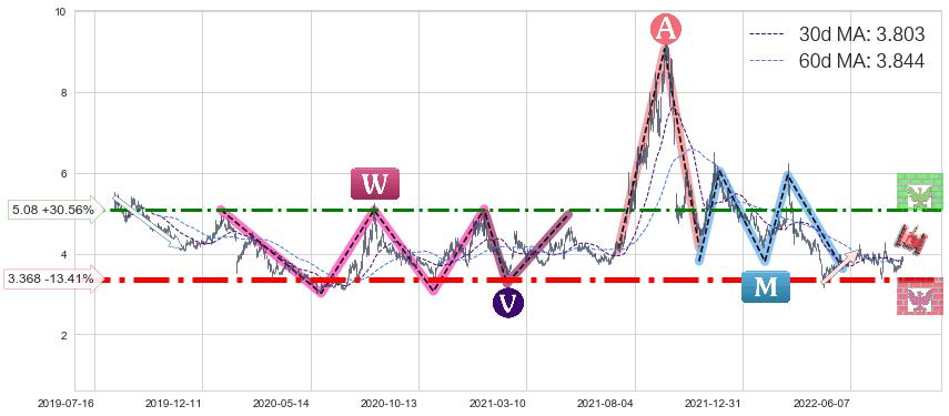 ♘ 阻力价格位5.08,可信任强度61.26%,距离最后交易2022-08-12形成的收盘价格3.890相差 +30.56%