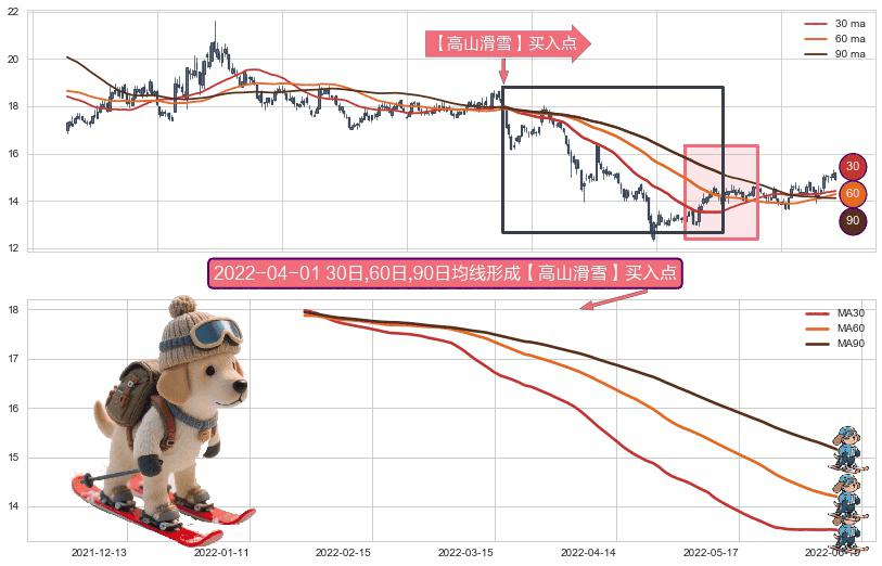 ⚀ 2022-01-24日-2022-06-09日显现 30日-60日-90日均线 【高山滑雪】买入点 看多信号,后市看涨,买入