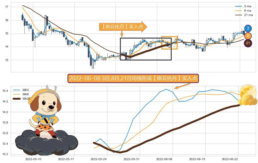 ⚀ 2022-05-20日-2022-06-23日显现 3日-8日-21日均线 【烘云托月】买入点 看多信号,后市看涨,买入