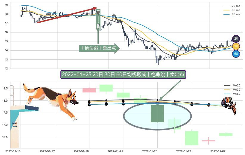 ⚀ 2022-01-25日显现 20日-30日-60日均线 【绝命跳】卖出点 看空信号,后市看跌,卖出