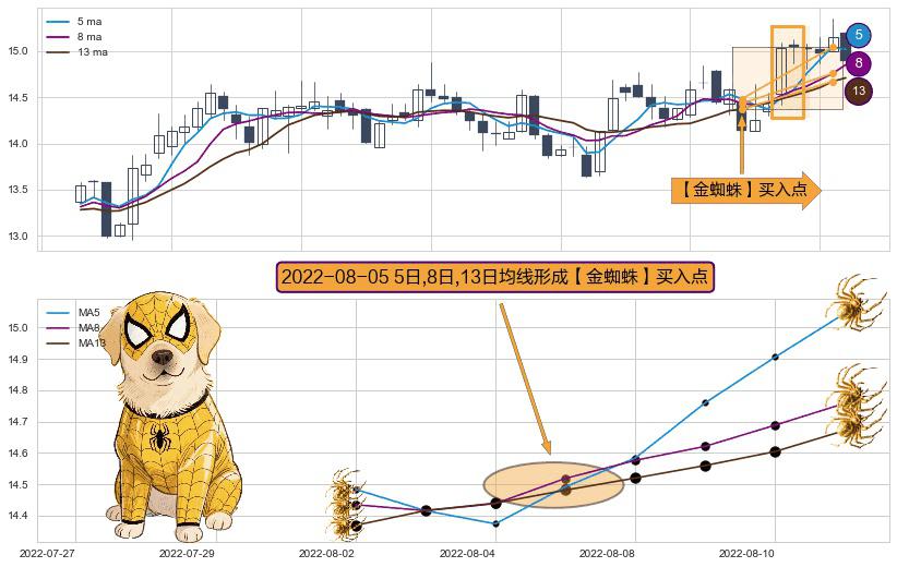 ⚀ 2022-08-05日显现 5日-8日-13日均线 【金蜘蛛】买入点 看多信号,后市看涨,买入