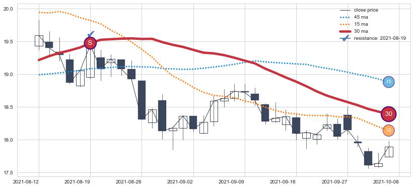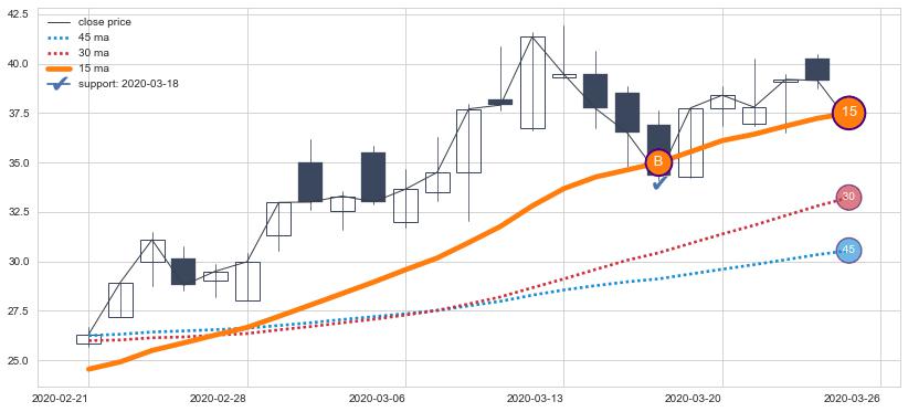 ⚁ MA3和MA8走势平行,且始终保持在短距离内,MA21始终在短中期均线下方,与短中期均线保持一定的距离,微微上行