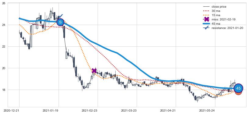 ⚄ 均线向上突破后价格围绕均线附近波动,并未远离均线,再次向下破位后维持原均线下跌趋势【极强】