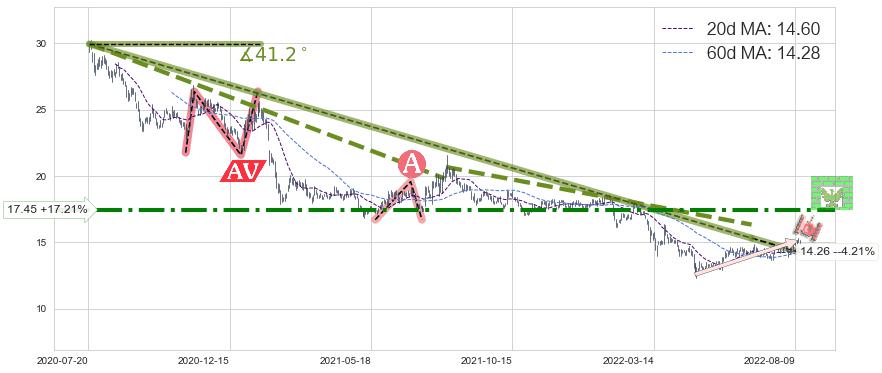 🦴 长线均值回复组合短线趋势跟踪[强阻力信号]2020-07-21-2022-06-27下跌趋势依然成立(下跌趋势跟踪依然存在),短线价格略微上行反弹(均值回复猜想),即将接近下跌趋势提供的未破位阻力价格:14.26。