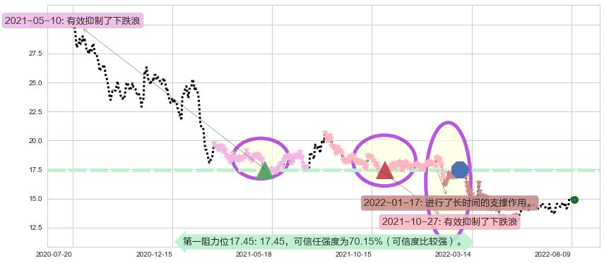 ♘ 阻力价格位17.45,可信任强度70.15%,距离最后交易2022-08-12形成的收盘价格14.89相差 +17.21%