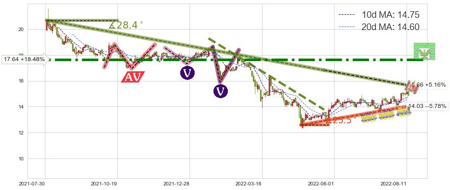 ♘ 阻力价格位17.64,可信任强度96.83%,距离最后交易2022-08-12形成的收盘价格14.89相差 +18.48%