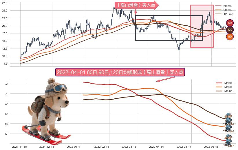 形态多维评估: ⚀ 2022-01-12日-2022-06-22日显现 60日-90日-120日均线 【高山滑雪】买入点 看多信号,后市看涨,买入