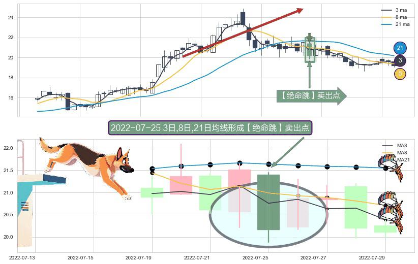 形态多维评估: ⚀ 2022-07-25日显现 3日-8日-21日均线 【绝命跳】卖出点 看空信号,后市看跌,卖出