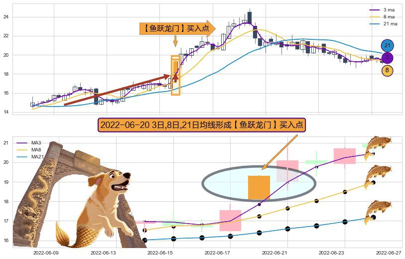 形态多维评估: ⚀ 2022-06-20日显现 3日-8日-21日均线 【鱼跃龙门】买入点 看多信号,后市看涨,买入