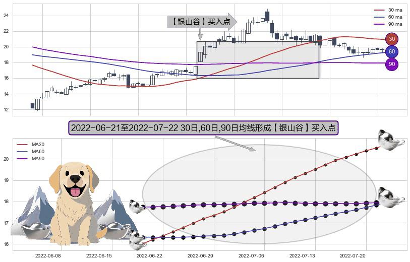 形态多维评估: ⚀ 2022-06-22-日至2022-07-22-日显现 30日-60日-90日均线 【银山谷】买入点 看多信号,后市看涨,买入