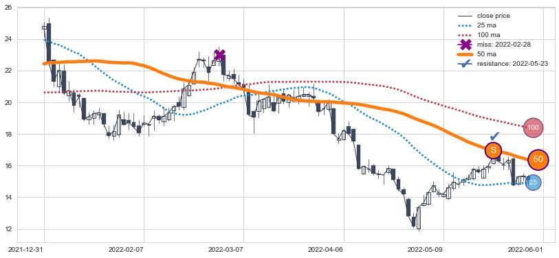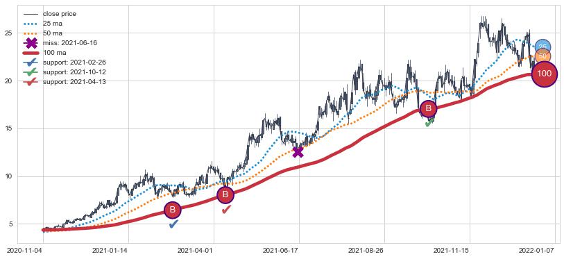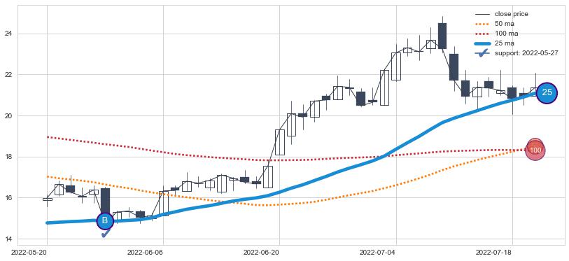 上涨趋势2022-05-20-2022-07-20,均线25确认关键支撑1处
