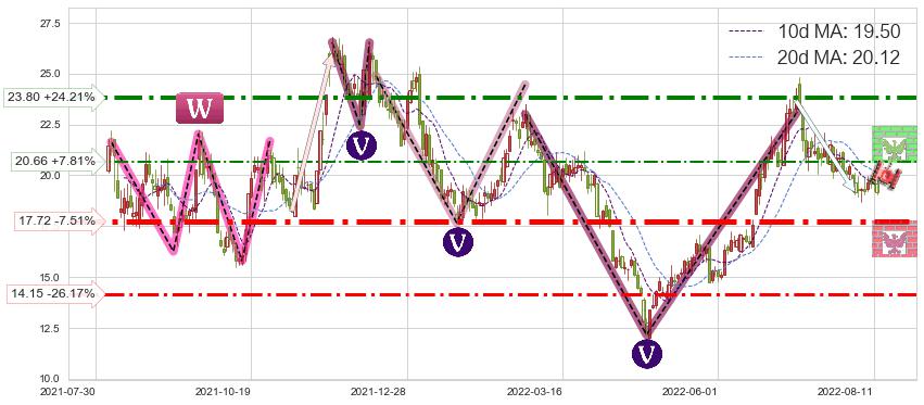 ♘ 阻力价格位20.66,可信任强度51.41%,距离最后交易2022-08-12形成的收盘价格19.16相差 +7.81%